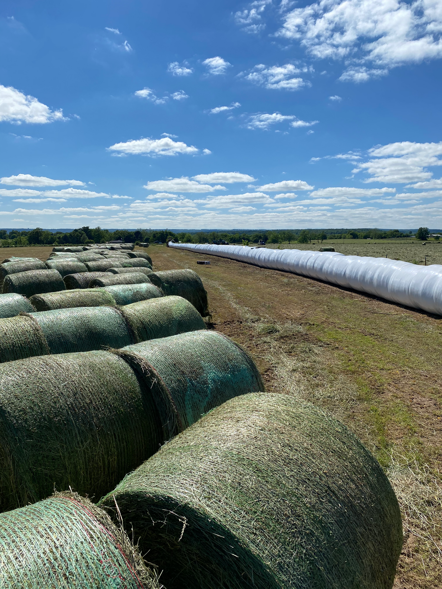 All year long our animals graze freely in our pastures and eat as much as they want. During normal spring seasons the first cut of hay will come around the end of April, first of May. However, this year due to an unusual lack of rain in March & April, we took our first cuts of hay at the end of May & first of June. We have cut our hay in two different ways over the years, straight wrapped when the hay is dry or rolled up while hay is still wet and wrapped in plastic to ferment over the summer months. Either way you wrap it the cows always come running when it's being rolled out!